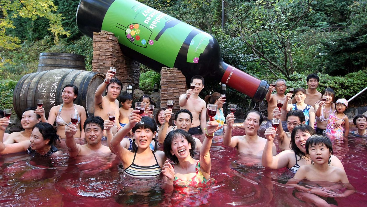 Ở Nhật Bản, Hakone Kowwakien Yunessun cung cấp dịch vụ ngâm mình trong rượu cồn và rượu sake kế bên suối nóng tự nhiên với chi phí 34$. Rượu sake được nhỏ liên tục vào nước nóng, ngâm mình vào đó giúp bạn xóa tàn nhang và đốm sắc tố do ánh nắng mặt trời. “ Mặc dù hiệu quả vẫn chưa thấy rõ và đang được nghiên cứu thêm nhưng bầu không khí vui vẻ sẽ khiến người tắm cảm thấy thích thú”– theo giám sát viên Asami Nagashima.