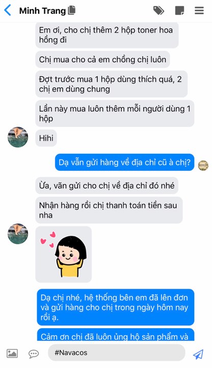 Hạnh rất quan tâm và chăm sóc da cẩn thận. Thường thì Hạnh bị kích ứng với mỹ phẩm nên khá kĩ tính lựa chọn các sản phẩm chăm sóc da. Sau khi được bạn bè giới thiệu Toner Navacos, Hạnh có dùng thử một thời gian và sau đó thì ” nghiện” luôn!!! Công nhận là dùng thích, an toàn và lành tính.