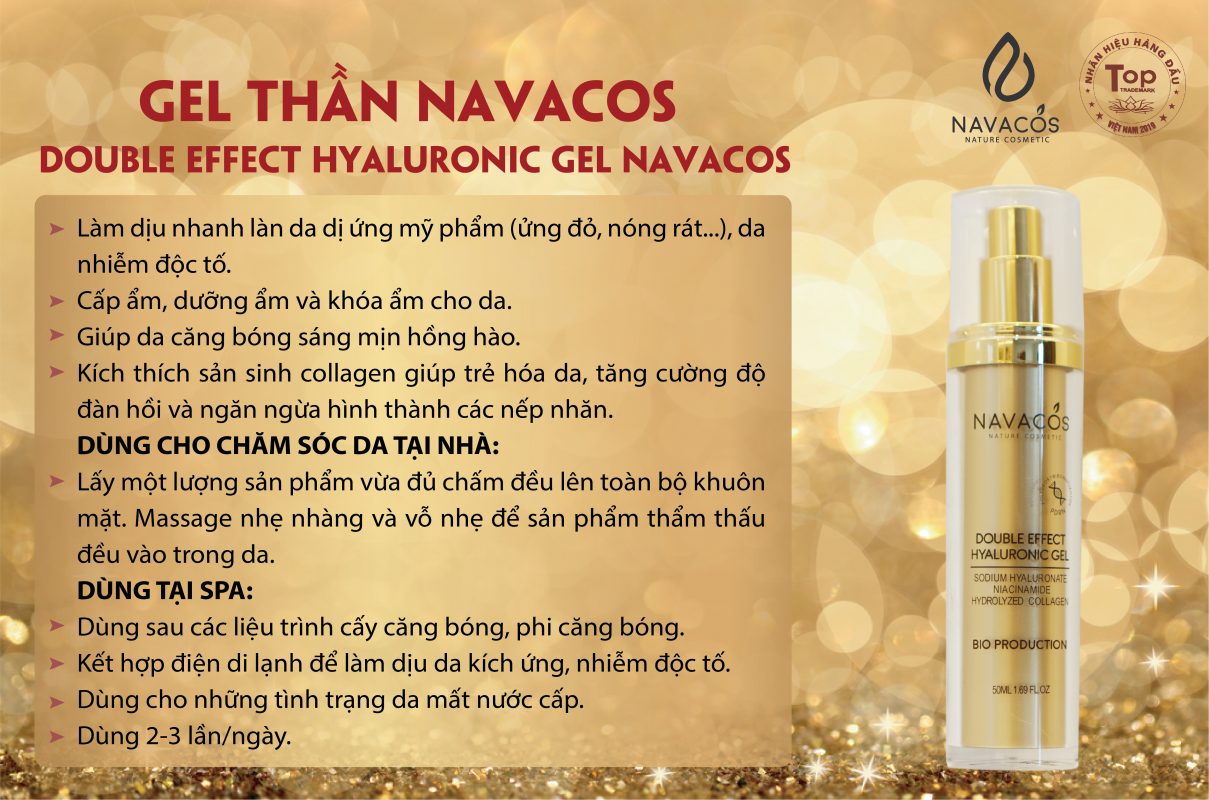 Gel thần Navacos Double Effect Hyaluronic Gel – Công nghệ kép cấp ẩm phục hồi da là sản phẩm dạng gel thế hệ mới được chiết xuất từ các thành phần thiên nhiên an toàn và lành tính cho da, có tác dụng cấp ẩm và phục hồi cho mọi loại da, kể cả làn da tổn thương, nhạy cảm. Gel HA Navacos chứa hoạt chất Sodium Hyaluronate dạng phân tử kép: Khả năng ngậm nước nhiều gấp 1000 lần trọng lượng phân tử (tức là cứ 1g Acid Hyaluronic có thể chứa tới 6 lít nước) có thể thấm sâu xuống tầng hạ bì cải thiện độ ẩm tối ưu cho làn da, hấp thụ các chất chống oxy hóa làm giảm sự xuất hiện những nếp nhăn li ti, mang đến làn da tươi trẻ.