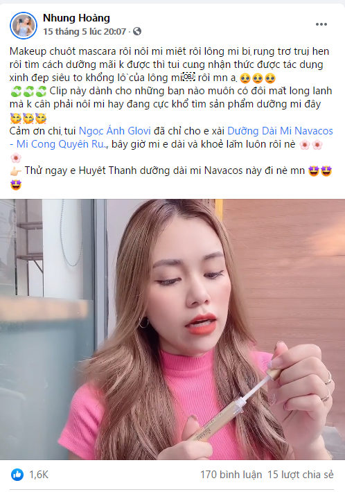 Mới đây hotgirl Nhung Hoàng hơn 100K follow đã bất ngờ chia sẻ với các fan bí quyết dưỡng mi nhanh dài, dày và chắc khỏe của mình trên trang facebook cá nhân. Theo như chia sẻ của cô nàng hotgirl Nhung Hoàng, vì đặc thù công việc cô nàng thường xuyên phải makeup, thường xuyên sử dụng mascara nên lông mi bị rụng rất nhiều. Cô nàng hotgirl đã cực kỳ stress và tìm mọi cách để khắc phục hậu quả của việc rụng mi, mi yếu nhưng không hiệu quả. Cho đến một lần được người quen giới thiệu cho sản phẩm serum dưỡng mi của thương hiệu Navacos.